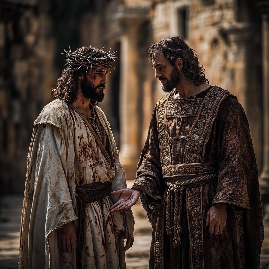Перед Пилатом - земным судьёй, в чьей власти была Его жизнь по человеческому суду - Он не сказал ничего. Не потому, что не мог. Но потому, что сердце Пилата уже не искало истину, оно колебалось между страхом и политикой. Оно слышало голос жены, голос совести, но не решалось последовать за правдой. И Христос - молчал.