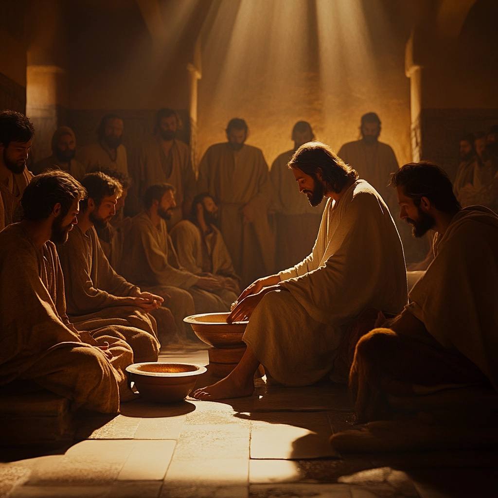 Иисус и ученики (Иоанна 13:14-15) - Во время Тайной Вечери Иисус омыл ноги ученикам, показав, что истинная любовь выражается в служении, а не в поиске власти или самоутверждении. Даже зная, что один из них предаст Его, Он не отверг Иуду, но продолжал проявлять любовь.