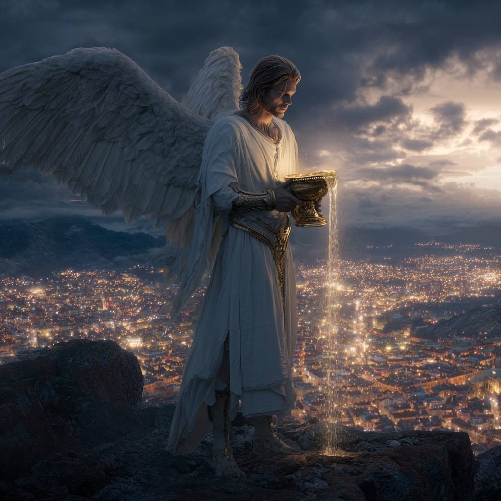 И сейчас первый Ангел словно уже поднимает чашу над землёй, и первые капли начинают падать. Время сокрытого подходит к концу. Всё, что прячется под маской веры и привычных слов, выходит наружу. Свет Божий касается глубины, и там, где мы боялись смотреть, проявляется правда.