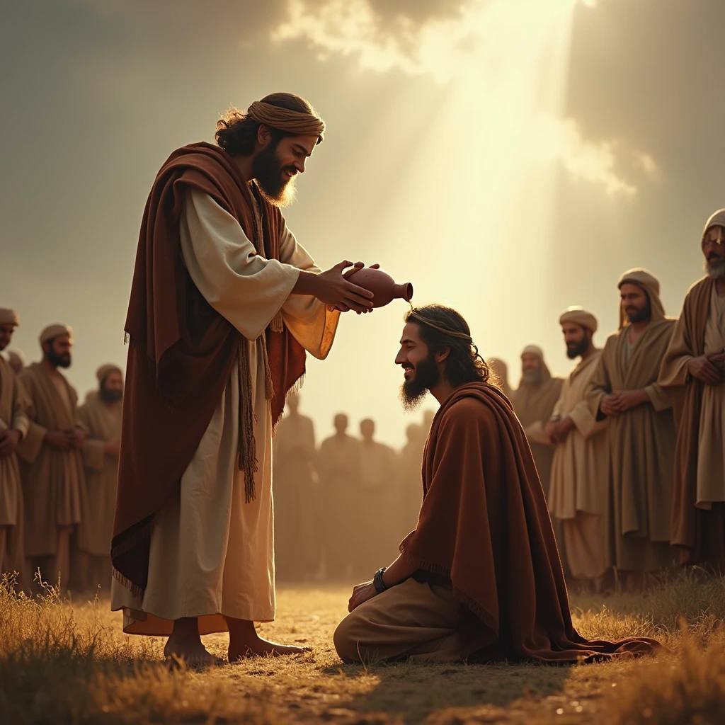 1 Царств 10:1 "И взял Самуил сосуд с елеем и вылил на голову его, и поцеловал его и сказал: вот, Господь помазывает тебя в правителя наследия Своего:"