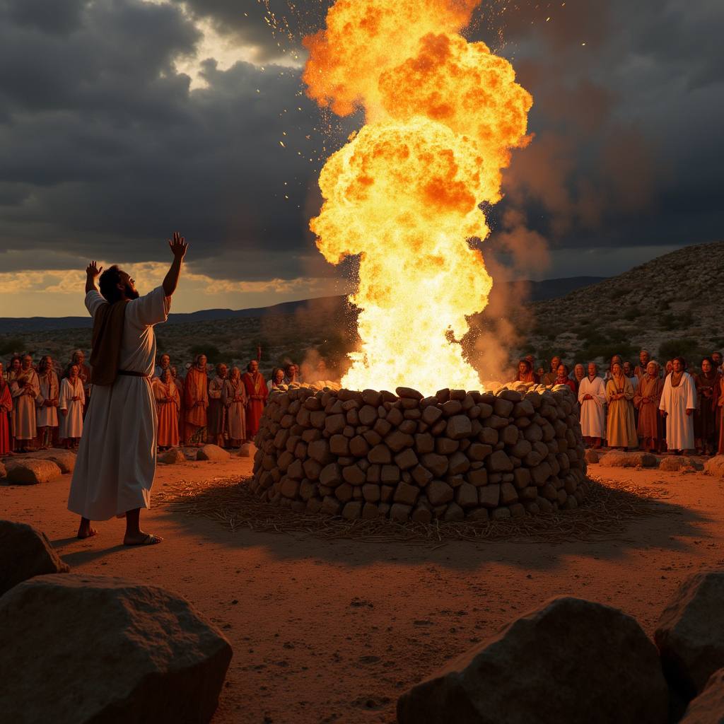 В ответ на его молитву Бог ниспосылает огонь с неба. Этот огонь не просто сжигает жертву — он поглощает всё: дрова, камни, воду и саму землю вокруг жертвенника. Это было явное и бесспорное проявление Божьей силы.
