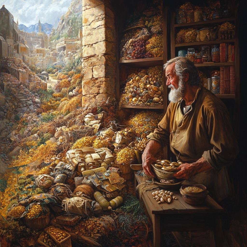 В этой притче Иисус рассказывает о богатом человеке, который накопил много имущества и решил построить ещё большие амбары, чтобы хранить свои богатства.